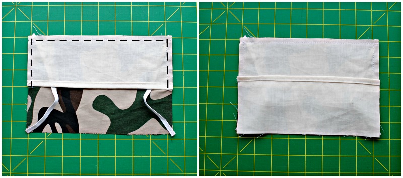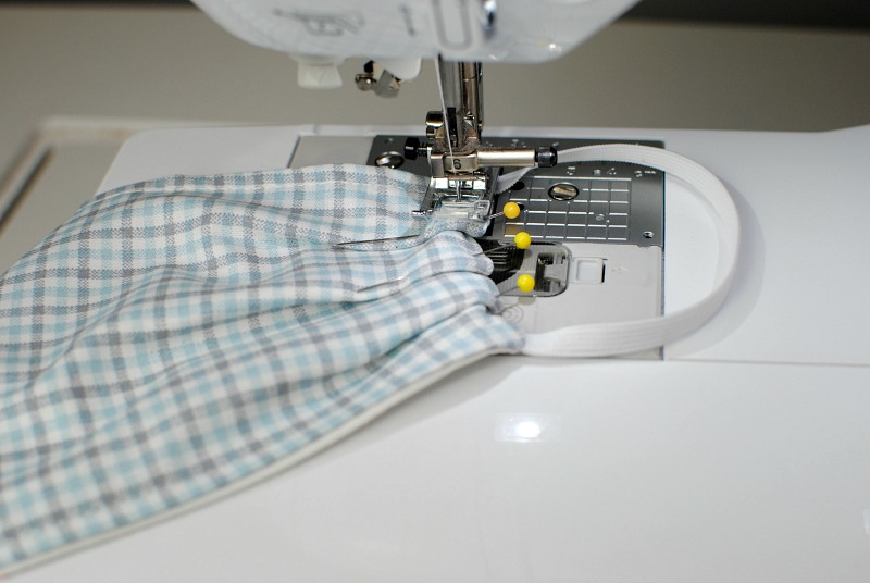 When you sew, leave a 2" gap at the center bottom so you can flip right sides out. Stitch with a 1/4" seam allowance. Make sure the elastic is through the seam allowance (we don't want these to snap on someone). You can even back stitch at the corners a couple times to ensure they're secure.