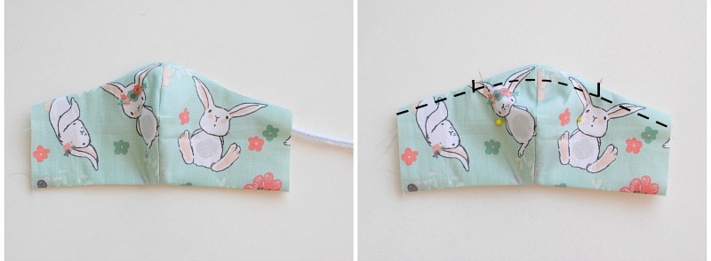 Topstitch 1/4" seam allowance or less to encase the pipe cleaner from end to end. Stitch the sides of the pipe cleaner as well to keep it from shifting. This should create a nose bridge.
